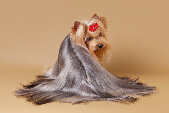 yorkie puppy on light brown background