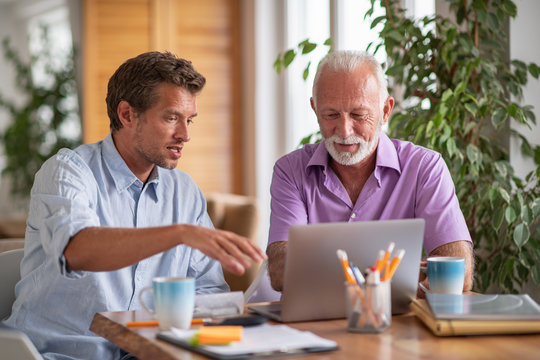 Smiling handsome boy, young nephew teaching technology to his old grandmother using laptop. Senior woman learns to use computer, shopping online, make reservations
