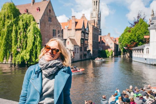 A beautiful young girl sits on the background of a famous tourist spot with a canal in Bruges, Belgium