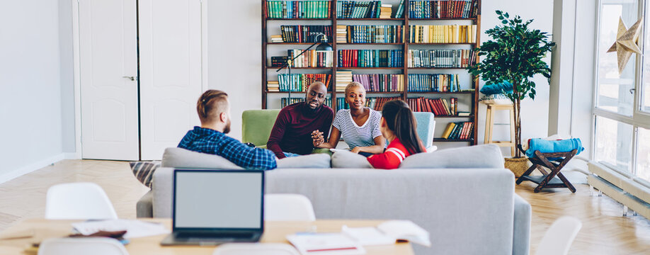 Group of young people doing check-in of youth hostel guest house - Happy tourists talking with receptionist at hotel lobby - Summer vacations and tourism concept
