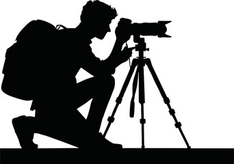 handsome anime guy photographer holding a retro camera in his hands on a white background