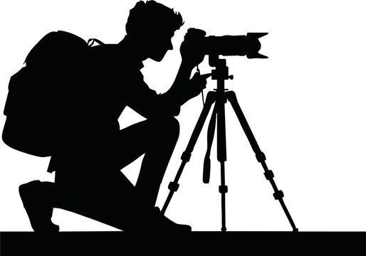 Cheerful hipster girl holding a camera takes a photo in a flat vector illustration; a funny young woman, an amateur photographer, stands alone on a white background with modern equipment, looking