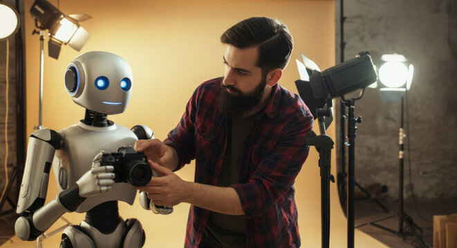 A photographer teaches his student how to use a professional camera. They are on a white cyclorama and look happy.