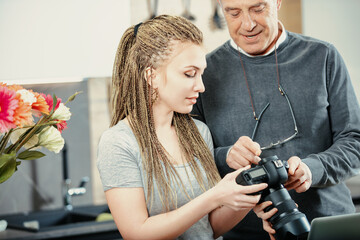 Mentor and Apprentice: A seasoned photographer, wearing glasses and a lanyard, mentors a young female apprentice as they review images on a DSLR camera.
