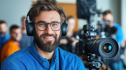 joyful young man wearing glasses and headphones is setting up a professional camera in a well-lit studio. He appears engaged in a media workshop, surrounded by other participants