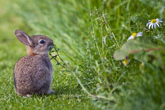 Wild young rabbit sniffing wildflower in country garden, The Cotswolds, Oxfordshire