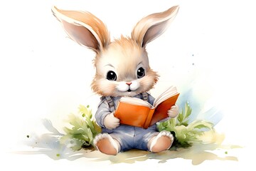 Cute cartoon rabbit sitting with book. Hand drawn watercolor illustration