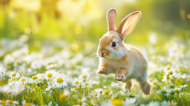 Sleeping lovely gray white rabbit on meadow with chamomile flowers