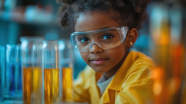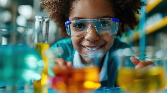 A young girl in a lab coat and goggles enthusiastically conducts a colorful science experiment with bubbling liquids in beakers and test tubes, illustrating curiosity and discovery