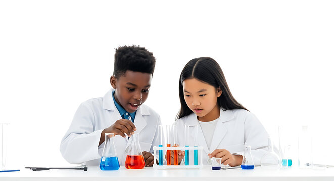 These young scientists, wearing lab coats and safety goggles, enthusiastically conduct experiments in lab setting, eager to make new discoveries