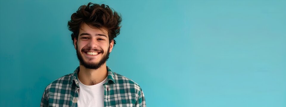 Smiling young computer programmer working in colorful studio setting