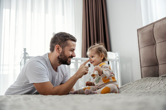 A little girl is sitting on a bed in a bedroom while her father booping her nose.