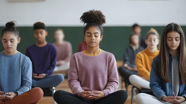 A diverse group of young individuals practicing mindfulness and meditation in a serene indoor environment.