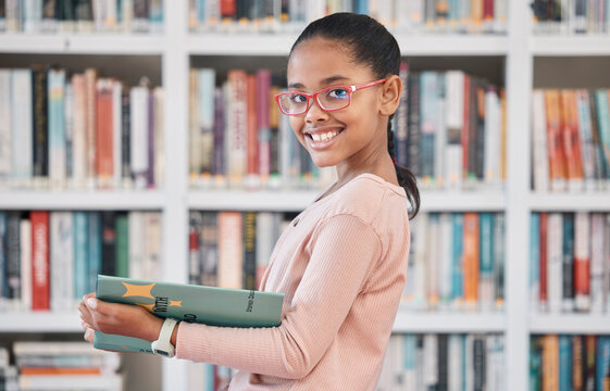 Books, education or girl reading in library for knowledge or development for future growth. Scholarship, portrait or school student with a happy smile studying or learning information in a fun story