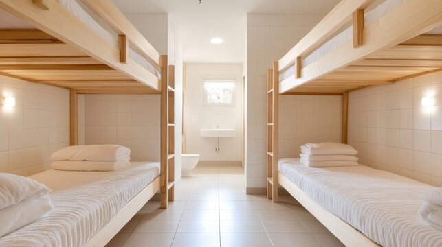 A person steps into a hostel room, showcasing a cozy atmosphere with bunk beds and a backpack, perfect for travelers seeking adventure