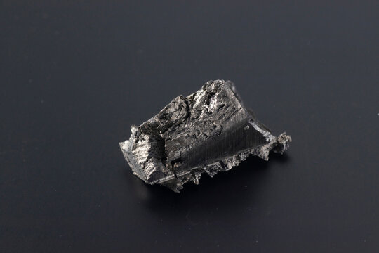 A detailed shot of rare earth element Ytterbium in its natural mineral form, showing metallic-gray chunks with yellowish tint from surface oxidation