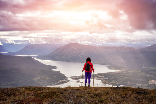 Adventurous Girl Hiking up the Nares Mountain during a cloudy and sunny evening. Taken at Carcross, near Whitehorse, Yukon, Canada.