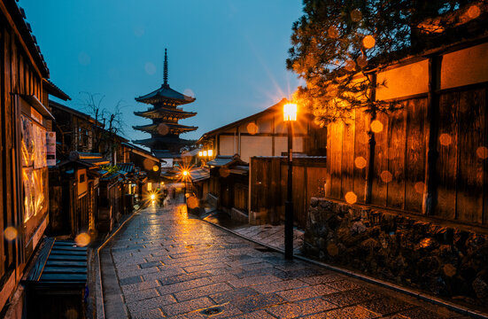 Beautiful sunset at Yasaka Pagoda and Sannen Zaka Street in summer, Kyoto, Japan. Yasaka Pagoda is the famous landmark and travel attraction of Kyoto.