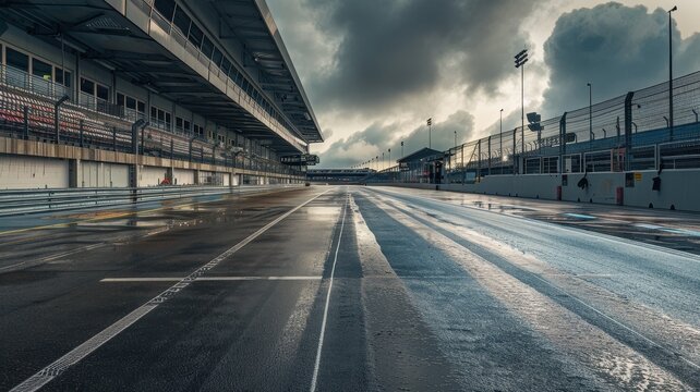 An empty pit wall at Circuit Zandvoort features a reflective wet surface, under a dramatic sky. This image captures the serene atmosphere of a racing venue waiting for action.