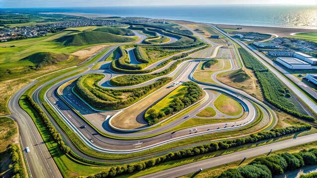 Aerial view of the Zandvoort race track circuit with sharp turns and sweeping curves, aerial view, race track, circuit