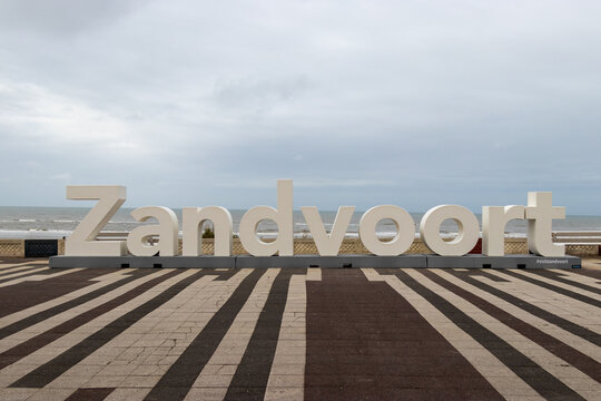 zandvoort Beachfront Sign with Geometric Tile Pattern on Cloudy Day: Coastal Landmark at the Dutch Seaside