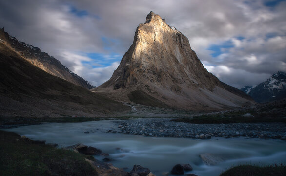 Play of lights and shadows on gumbo Rangjan Peak in Zanskar region of Ladakh, India