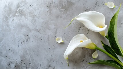 Beautiful zantedeschia or white calla lily on light grey background. Copy space. generative AI