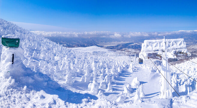 Snow monsters (soft rime) with cable cars passing through between them (Zao-onsen ski resort, Yamagata, Japan)