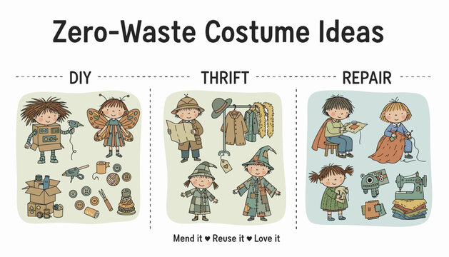 Kids creating zerowaste costumes through DIY thrift and repair promoting sustainability