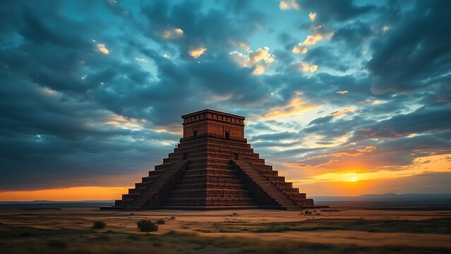 ziggurat. Ancient ziggurat tower rising from plains against a dramatic sky during the golden hour. real-estate listings.