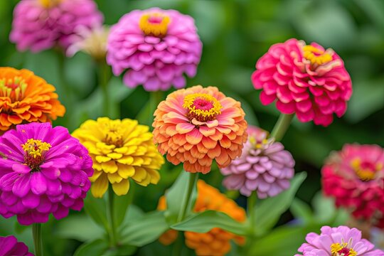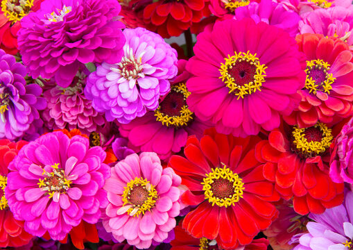 Colorful blooming zinnia blossoms in garden.Summer milti colored background.Sunny weather.Arrangement of flowers.Floriculture.