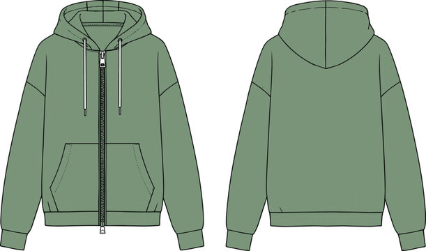 Front and back view hoodie flat sketch vector template, fashion clothing design, casual sweatshirt pattern, zip up hoodie illustration