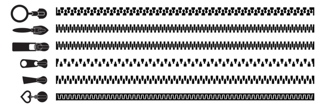 Zippers vector icon set. Open and closed zip fastener for clothing or bags. Zip puller, locker, and slider for sewing or tailoring projects. Black isolated illustration.