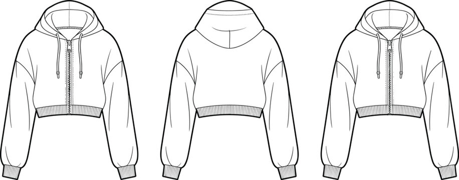 Cropped hoodie technical fashion flat sketch, zip up front view back view line drawing, CAD vector illustration template