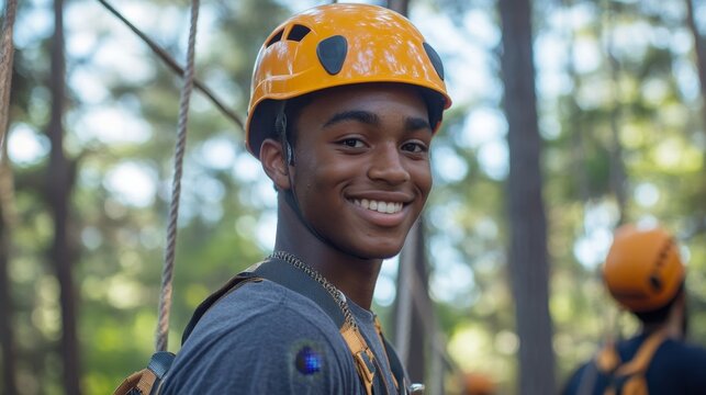 Young Man Wearing a Yellow Helmet Smiles in a Forest.
