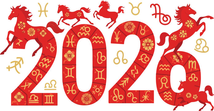 Fire horse zodiac year illustration on rich red background, horse made of golden flames gallops forward, horse energy symbolizes passion, adventure, bold luck theme for new year celebration