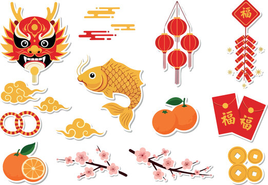 Chinese New Year Celebration with Dragon, Lanterns, Oranges, and Gold
