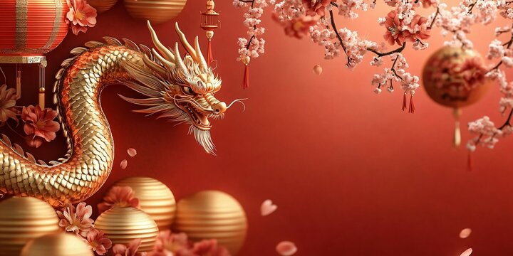 Vibrant digital illustration featuring a golden dragon and traditional lanterns, perfect for Lunar New Year celebrations, marketing materials, and festive events.