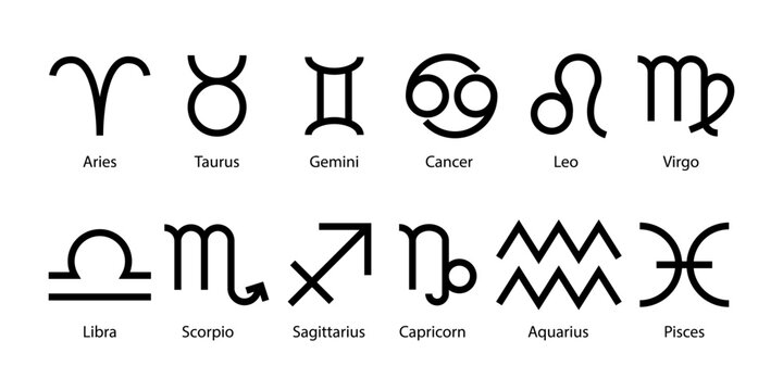 Set of 12 zodiac signs isolated on white background. Constellation of Aries, Taurus, Leo, Gemini, Virgo, Scorpio, Libra, Aquarius, Sagittarius, Pisces, Capricorn, Cancer.