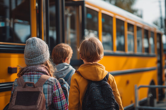 Group of children go to school with yellow school bus, Selective focus happy school kid on bus, Kindergarten student on public bus.