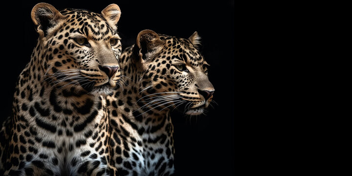 Portrait of two leopards or jaguars on an isolated black background. Generative AI