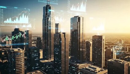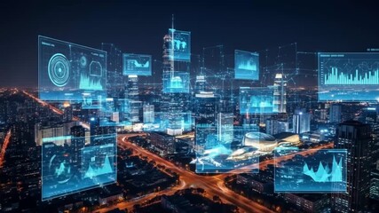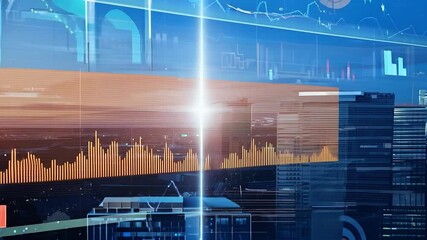 Abstract Data Analysis Interface Overlaying Skyscraper Videos