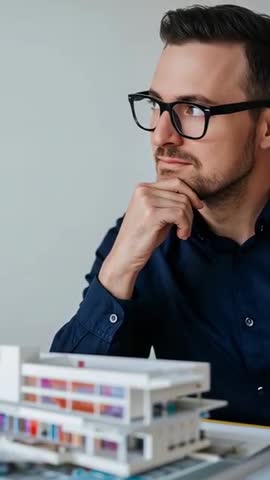 Architect Unrolling Blueprint And Pointing At Plan Lines In Vertical Video For Design Videos