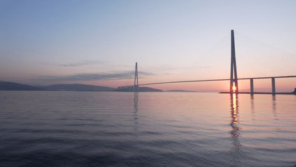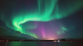 Aurora Dancing Over Cable Stayed Bridge With Green Reflection On Calm Harbor Water Videos