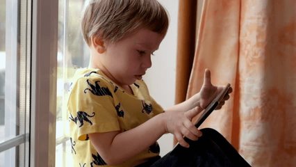 Boy Engaged With Tablet As Code Animations Overlay Videos
