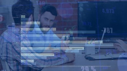 Business Team Discussing Technology Amid Digital Code Graphics Videos