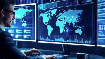 Businessman Analyzing Digital Data On World Map Interface Videos