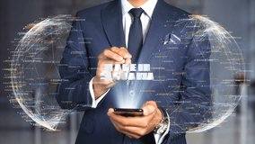 Businessman Using Smartphone Amidst Digital Data Holograms Videos