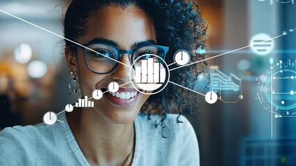 Businesswoman Analyzing Graphs And Charts In Modern Office With Digital Overlay Videos