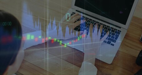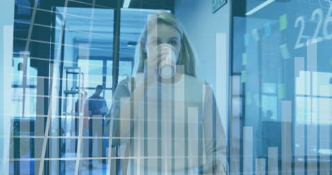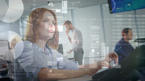 Businesswoman Analyzing Graphs And Charts In Modern Office With Digital Overlay Videos